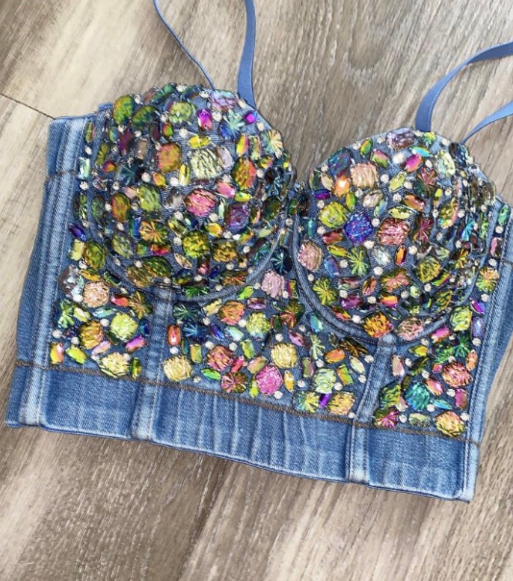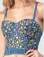 Sexy Statement making Barbie Girl Denim Rainbow Stones Pattern Crop Top Bustier.