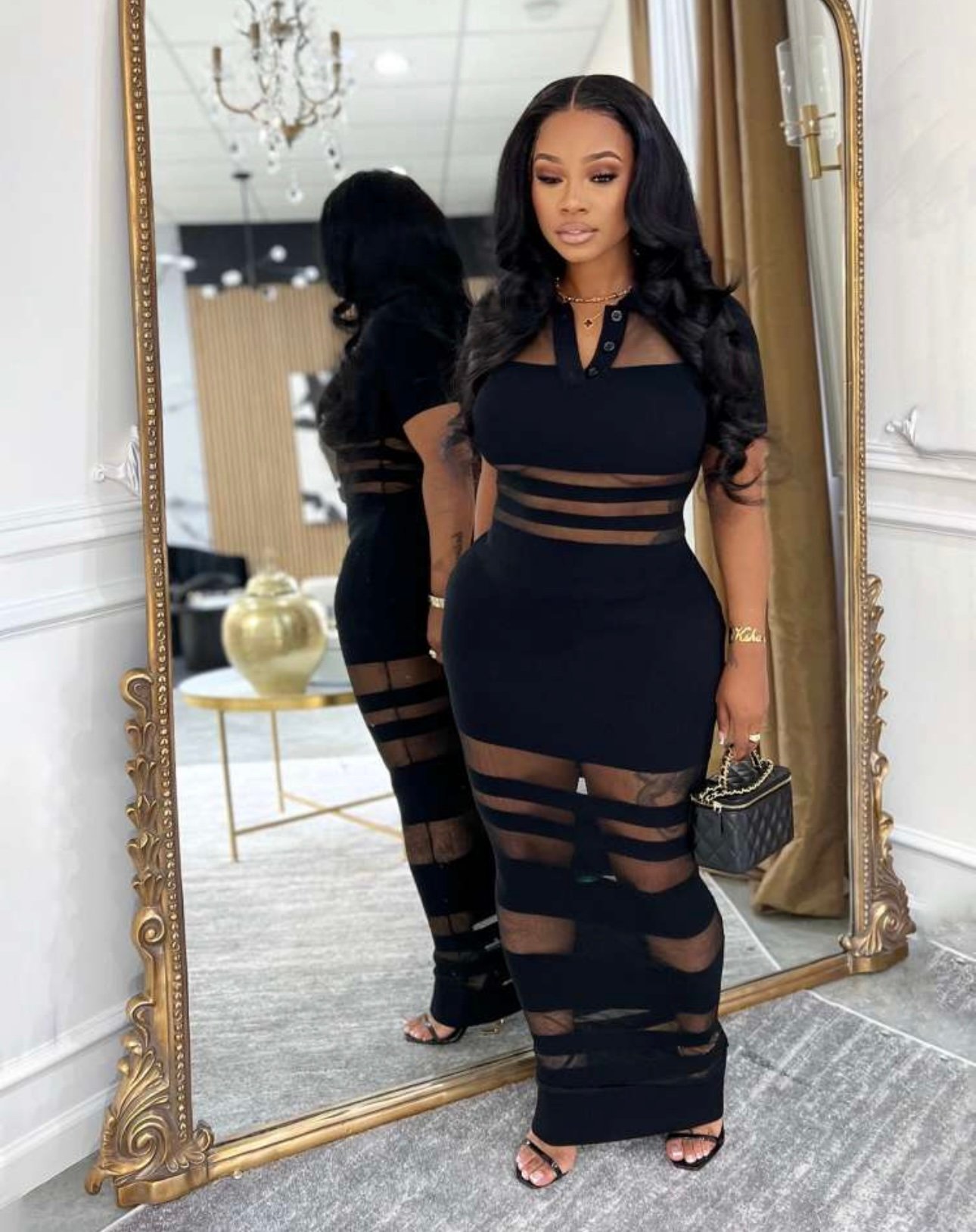 In stretch Cotton 3 Button V-neck collar In All Black is for the Win! Must have added to your Black Dress Collection!